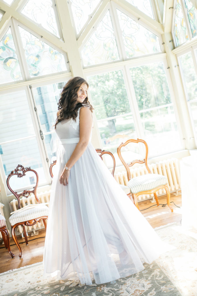 This wedding dress cut from fluid dotted tulle and silk crepe de chine in mushroom color. This floor-sweeping design skims beautifully over the bride’s body. Intricately embroidered and embellished with beads and 3D chiffon flowers and leaf appliques which are decorated with  sequins and light-catching crystals.